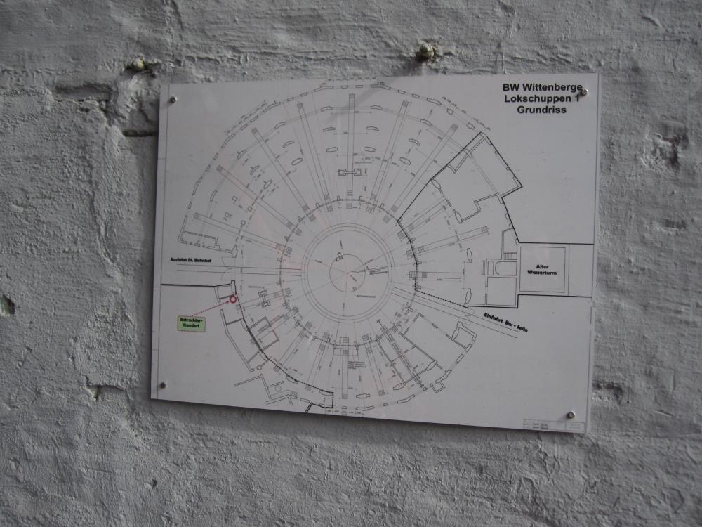 We are now on the area which was covered by former loco shed No. 1 of Wittenberge motive power depot. This was a rotunda, or totally enclosed roundhouse, with a turntable in the middle. The building was extremely striking, having a gigantic domed roof. However, this was destroyed by a storm in the 1980s. The building itself was demolished at the end of the 1990s as it was partially obstructing the course of the line being newly laid at that time between Wittenberge station and the bridge over the Elbe. A small fragment was left standing to serve as a car repair workshop and garage. The original arrangement of tracks in this building can be identified on the floor-plan. The position of the turntable can be recognised today by a circular car park.