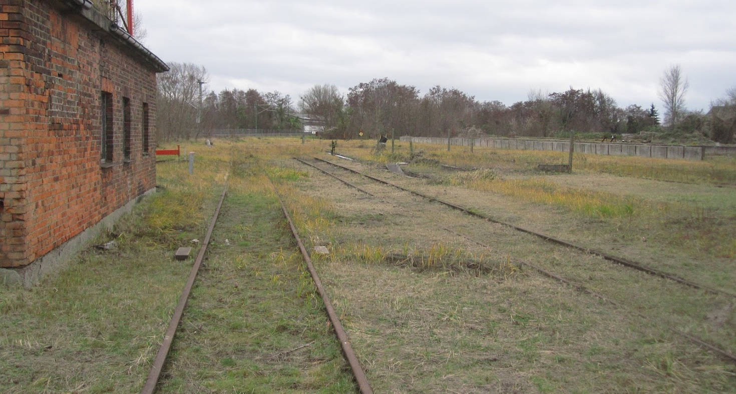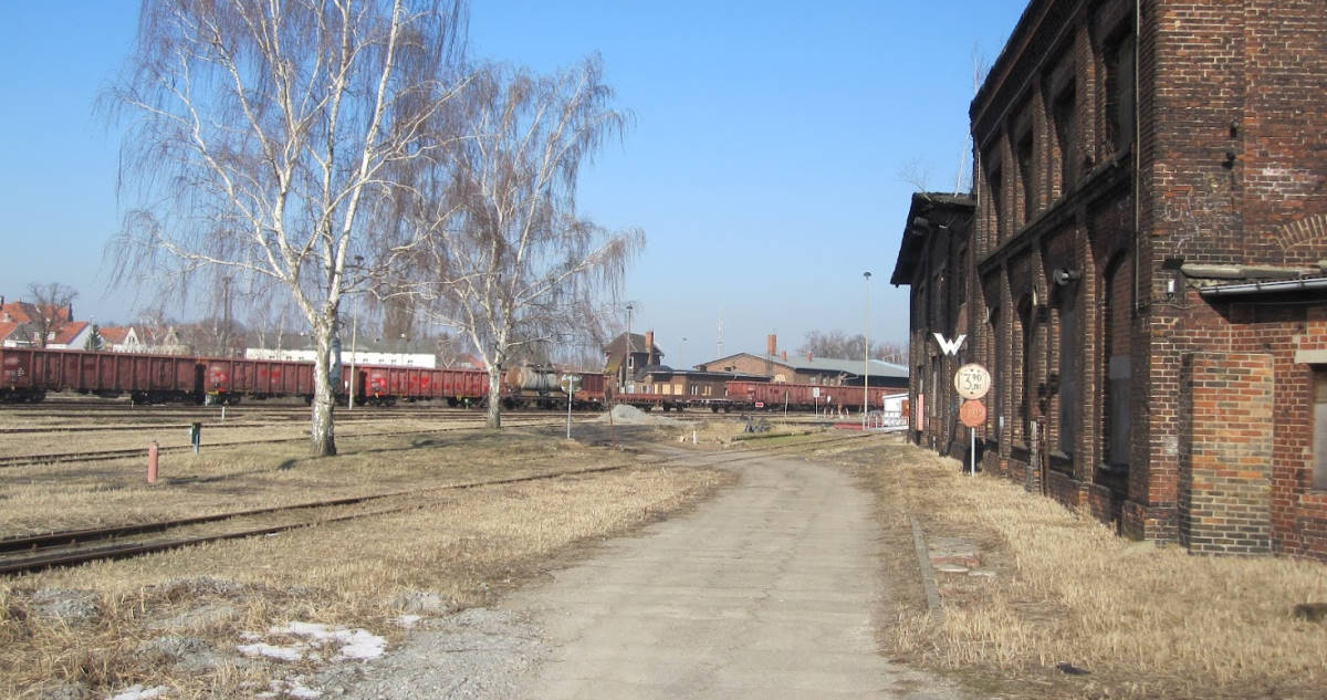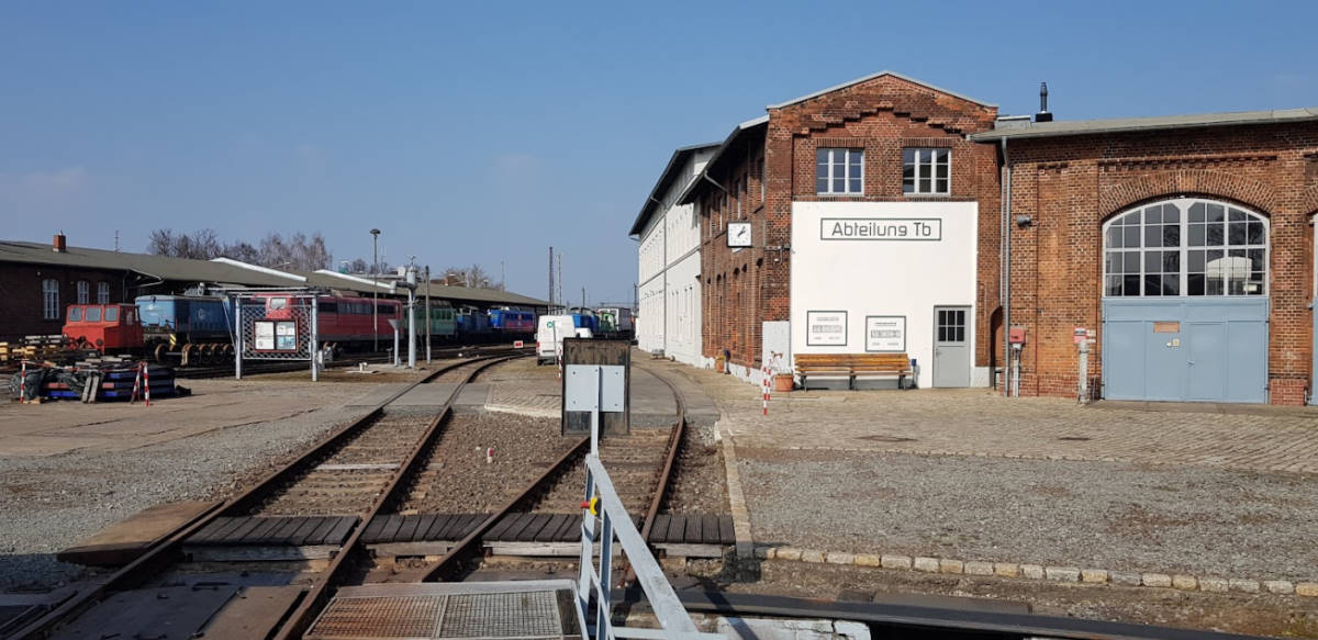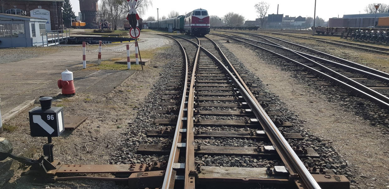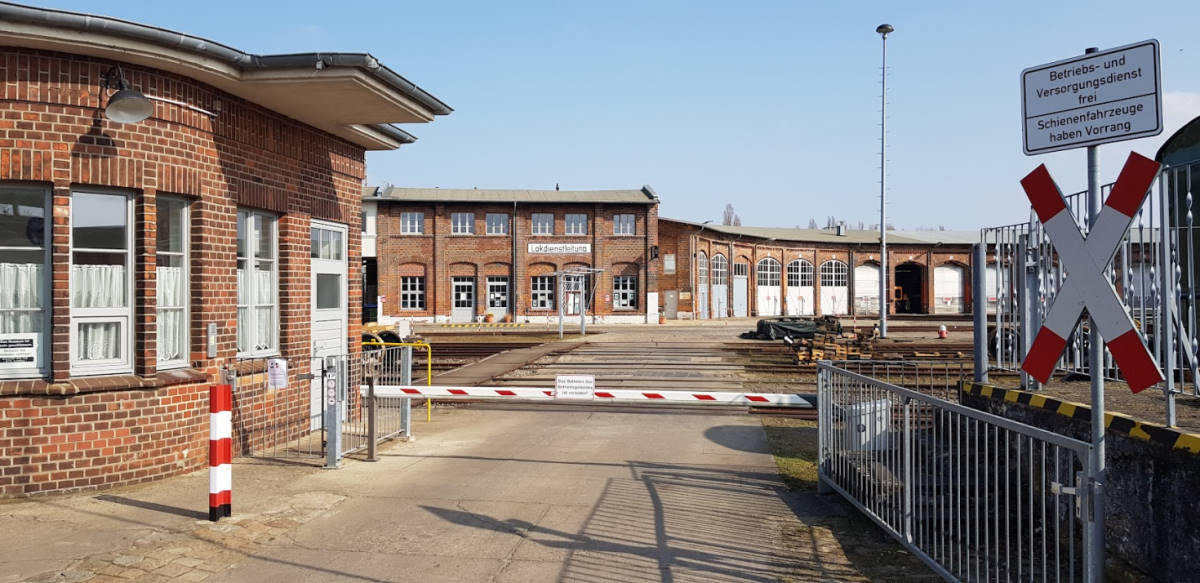 View of the former Magdeburg side of the station. This is where the trains went to and from the south until 1999. Today, our driver's cab rides take place here. A track-laying machine is also on display. The wasteland next to it has recently been revitalised by a road and a shopping centre.