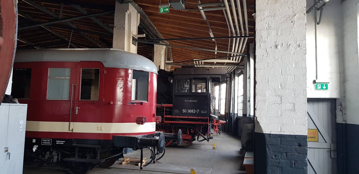 Blick zurück auf den Lokschuppen 2, der heute das Museum beherbergt. Rechts im Bild das ehemalige Wasserhaus, in dem sich ehemals große Wasserbehälter zur Versorgung der Dampflokomotiven befanden