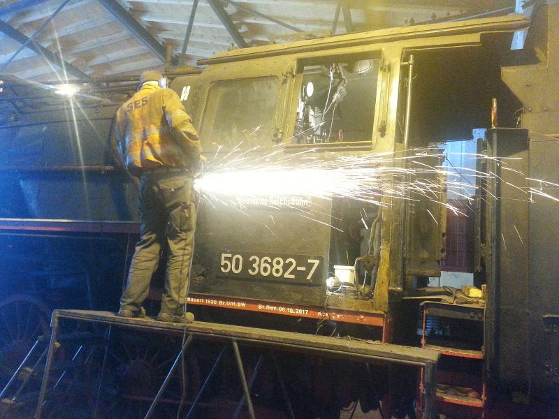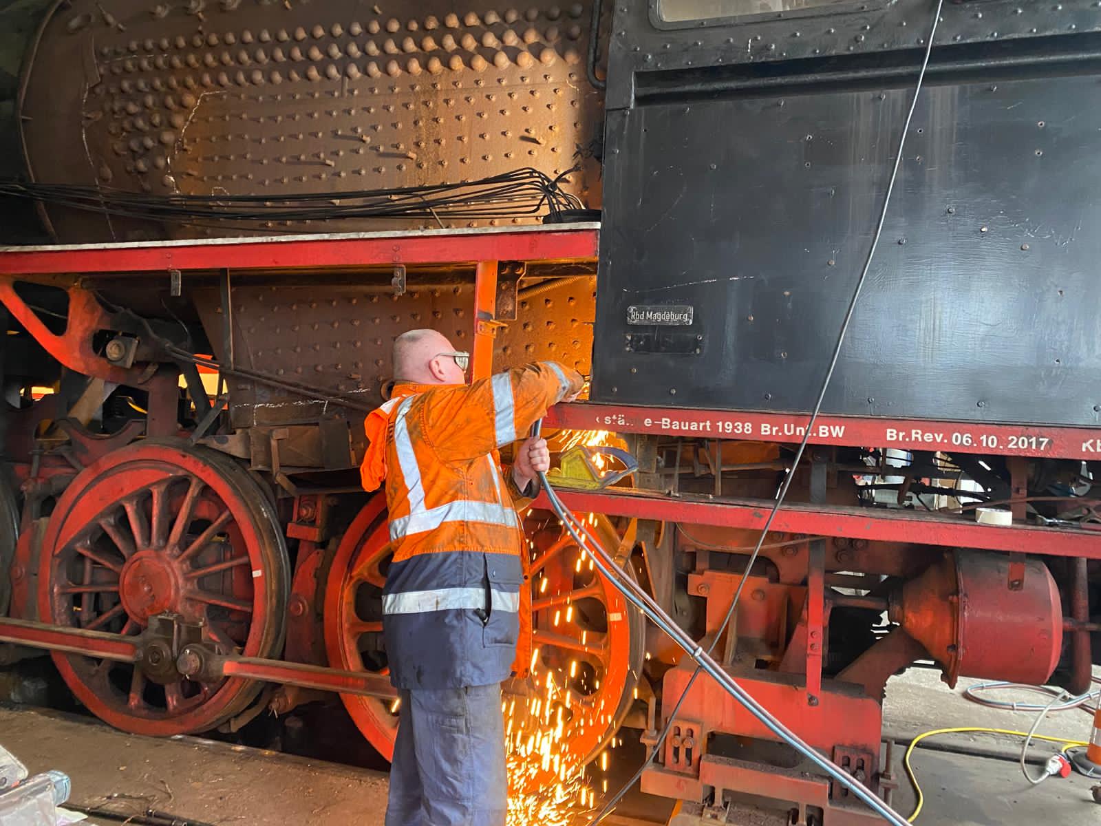 Before the season gets underway, we have made good progress on our steam locomotive 50 3682, which is currently being dismantled so that it can be fitted with a new boiler. Before that, however, the driver’s cab must be removed, which is currently the main task. You wouldn’t believe how many bolts and connections need to be loosened before the driver’s cab can be separated from the frame and the existing boiler. Quite a few of the bolts had seized up and could no longer be loosened. So the cutting torch was in constant use to cut them through. The attached photos show our colleagues at work.