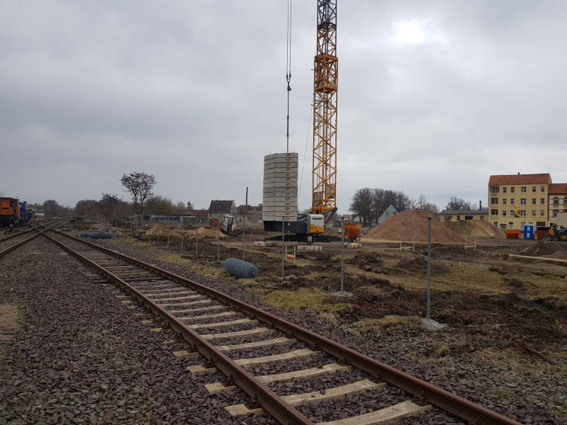 Construction work of a different kind is going on at the former Magdeburg side of the station. On the site of the former goods ramp and the milk yard, a supermarket with accompanying car park is being built. For this reason, our property boundary has been moved a bit and the fence has been relocated.