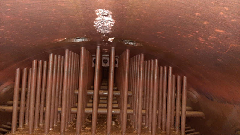 In the process, rare views from the inside of the boiler can be seen. The following picture shows the so-called ceiling anchors. These are the long metal rods to which the firebox is attached inside the boiler.