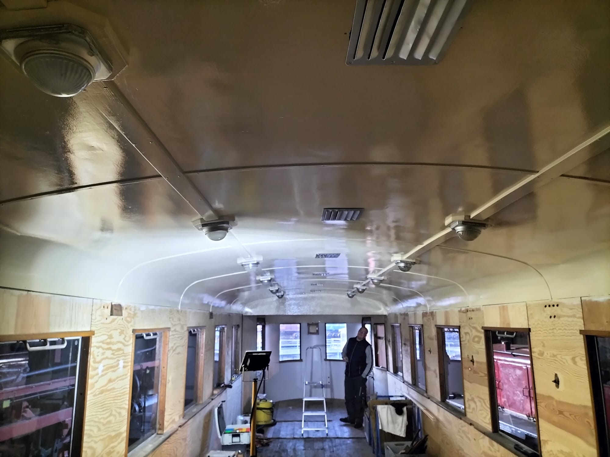 Further progress is also being made on coach 197 805, where our hard-working colleagues have rewired the ceiling lighting and installed the lamps. The ventilation grilles are also back in their usual place.