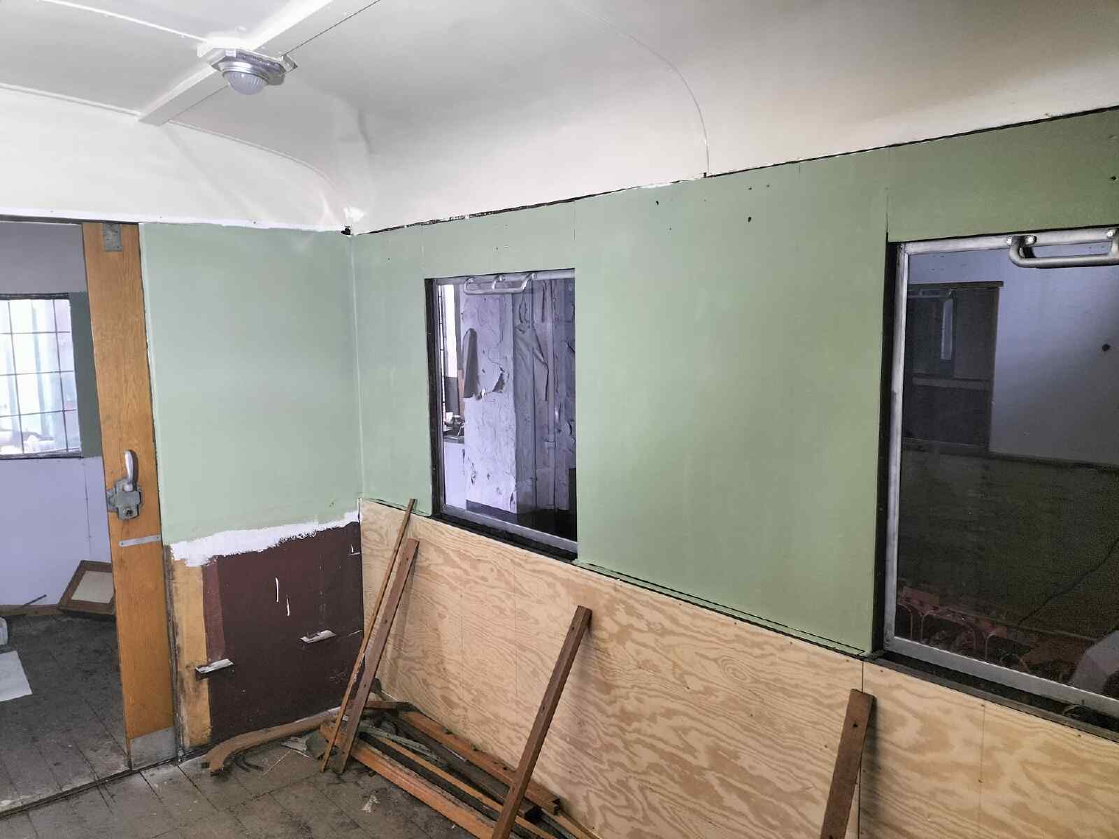 Work also continued on the interior of our 197 805 coach. The wall insulation and panelling have now been completed and are being painted. We are following the historical colour scheme. The window strip is given several layers of light green colour, which also contains a proportion of beige. Once the paint has dried, wooden mouldings are fitted to cover the gaps between the wall panels.