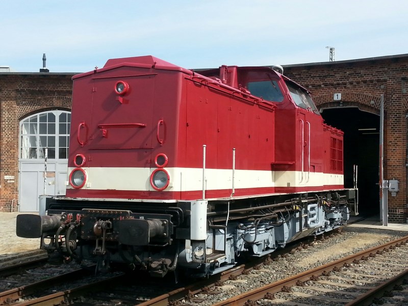 204 774-4 (Baureihe V 100 der Deutschen Reichsbahn) im Sonnenschein zu begutachten. Unser Vereinskollege Björn Strähle hatte die Lok in mühevoller Handarbeit angeschliffen, grundiert und schließlich mit Hochglanzlack neu lackiert. Danke dafür nochmal! Das Bild zeigt den derzeitigen Zustand. Bis zum 1. Lokschuppenfest am 09./10.05.2015 werden noch die Handstangen und Pufferträger schwarz und die Lampenringe silbern lackiert. Selbstverständlich werden auch noch die neuen Nummernschilder mit der Beschriftung