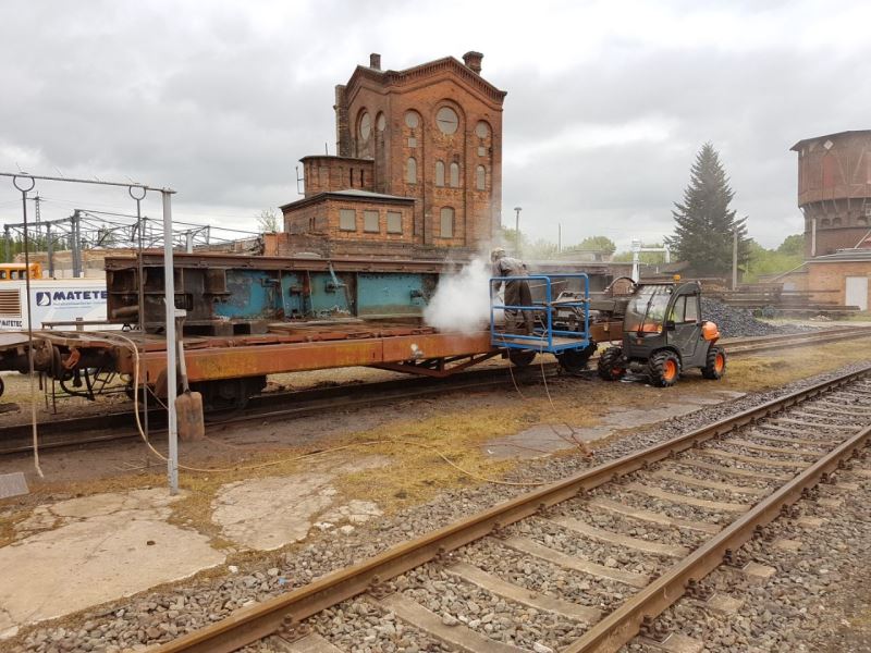 We have already reported elsewhere that the turntable in front of former loco shed 1 was scrapped at the end of the 1990s and the turntable pit filled in. Since it is the long-term goal of the society to reinstall this facility, the first steps have already been taken. Thus we were able to acquire a turntable deck from Parchim, which is to be installed in the turntable pit of locomotive shed 1, which can be reopened as it is the right length. Now the deck has been cleaned of old paint and rust by a specialist company using a high-pressure water jet and primed. The parts can now be examined, although we do not foresee any major difficulties. The pictures show the cleaning work on 23.5.2017.
