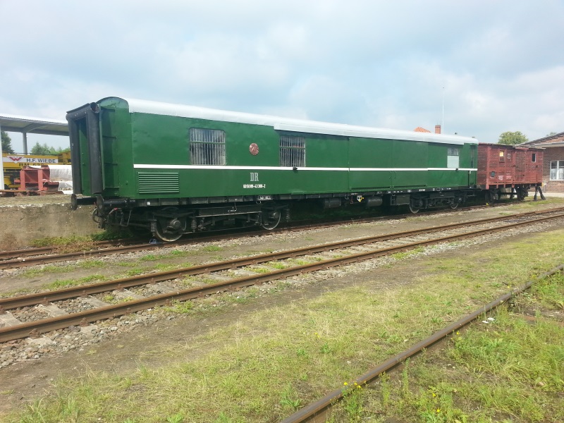 Die warme Witterung haben die Aktiven zur Aufarbeitung von Fahrzeugen genutzt. Zunächst wurde der Autotransportwagen aus dem Regierungszug von Walter Ulbricht neu lackiert und etliche Rostschäden behandelt. Der Wagen wurde dazu völlig entkernt und alle Türen ausgehängt, was bei der Größe der seitlichen Schiebetüren einiger Anstrengung bedurfte. Anschließend wurden Blecharbeiten insbesondere am Übergang vom Dach zum Wagenkasten durchgeführt. Danach wurde der gesamte Wagen grundiert und neu im historisch richtigen Farbton lackiert und mit neuer Beschriftung versehen. Außerdem wurden die Fenster neu eingefasst, um ein Eindringen von Regenwasser zu verhindern. Am 13.8.2017 war der Wagen wieder an unserer Güterrampe zu bewundern.