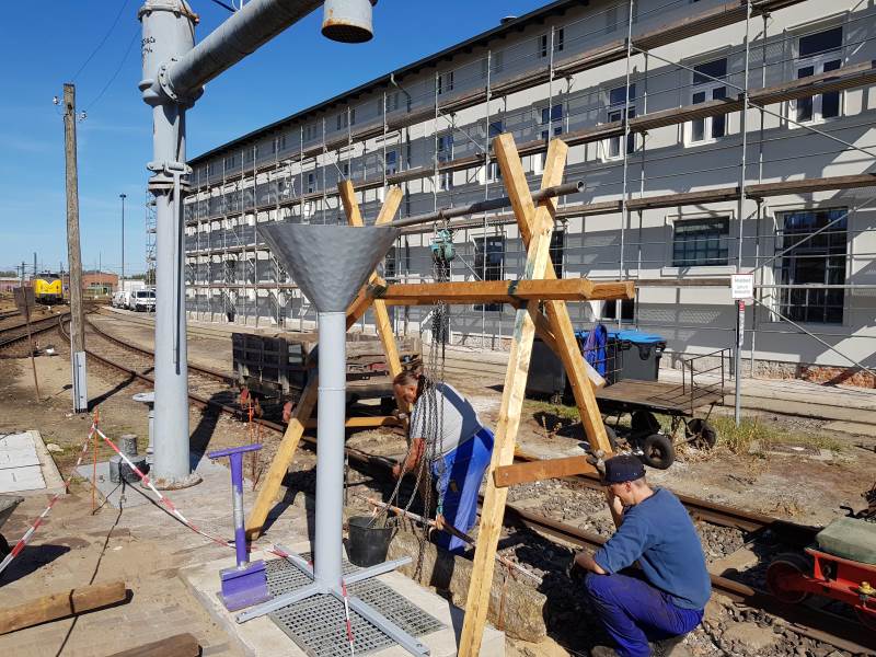 Außerdem gingen die Pflasterarbeiten am Wasserkran vor der Lokleitung weiter. Hier wurden Abschlusskanten aus Granit gesetzt. Da jeder Stein ungefähr 300 Kilo wiegt, wurde extra eine behelfsmäßige Hebeeinrichtung aus Holz angefertigt, um die Steine vom Transportwagen zu heben und in die endgültige Position zu setzen.