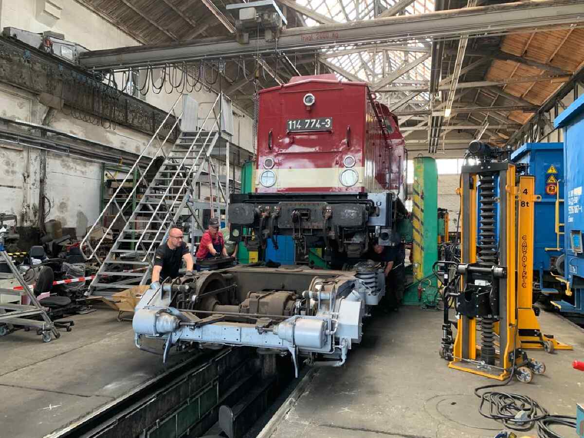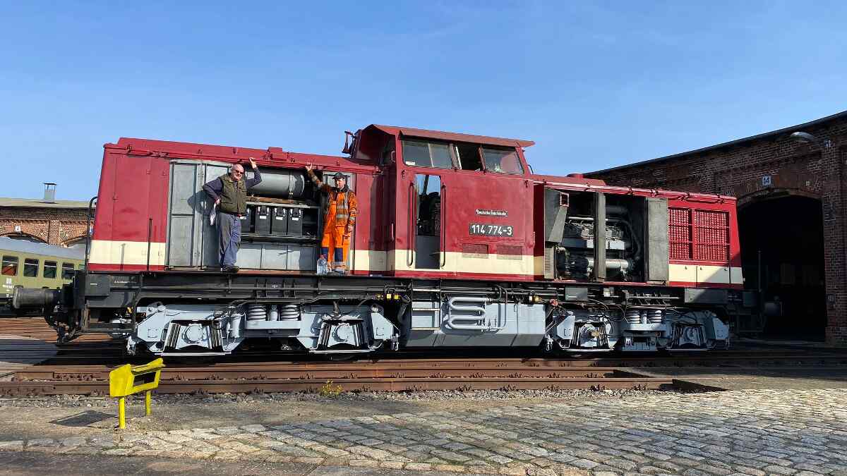 Bisher präsentierte sich der Stahlkoloss aber noch in den Farben der Deutschen Bahn AG. Bereits seit längerem stand für die Wittenberger Eisenbahnfreunde jedoch fest: 114 774 soll wieder in den Farben der ehemaligen Deutschen Reichsbahn (DR) erstrahlen.