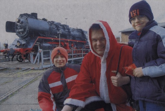 Eine Sinfonie in Schwarz, Rot und Weiß: Farblich bestens aufeinander abgestimmt waren am Sonnabend der Nikolaus (Dennis Alexander Berg) und die Schwarze Lady im Hintergrund. Auch Markus Goebel (links) und Lukas Rasmus staunten nicht schlecht, als aus dem Wagen, der hinter die Dampflok gespannt war, ein Mann mit rotem Umhang und Rute stieg. Sie hatten allerdings weniger Augen für die farbliche Abstimmung. Sie interessierte vielmehr, was der Nikolaus in seinem Sack hatte. Um es vorweg zu nehmen: Es waren Gummibärchen. Lukas ist übrigens echter Eisenbahnfan. Beim Einfahren der Lok referierte er über Baujahr und Typ-Nummer.