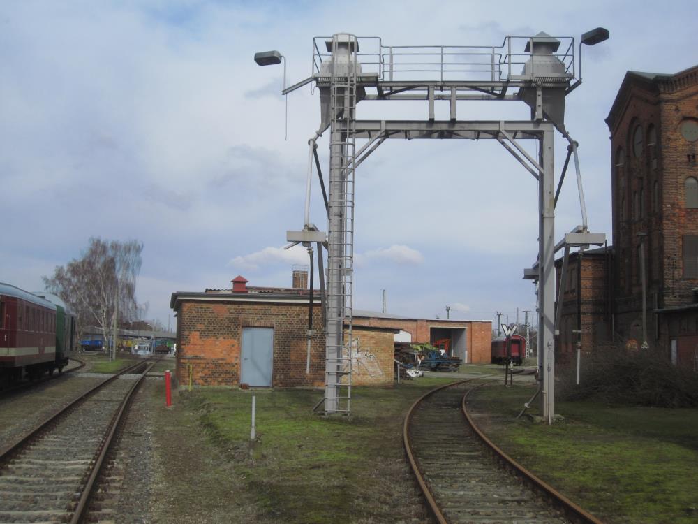 The frame visible in the picture last served as part of the sanding plant for locomotives. These always carry a supply of sand for spreading in front of the wheels on the rails when it is necessary to improve the adhesion between wheel and rail. This can be needed in slippery conditions to prevent the powered wheels slipping when accelerating or locking up when braking. On delivery, the sand was dried in the little hut behind on the left so that it would not form lumps when used in locomotives and block their sand fall-pipes and the spreader jets.