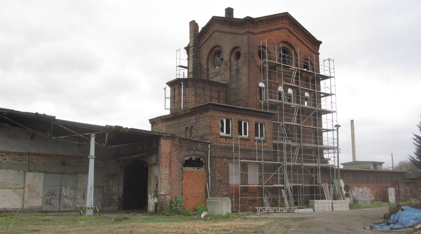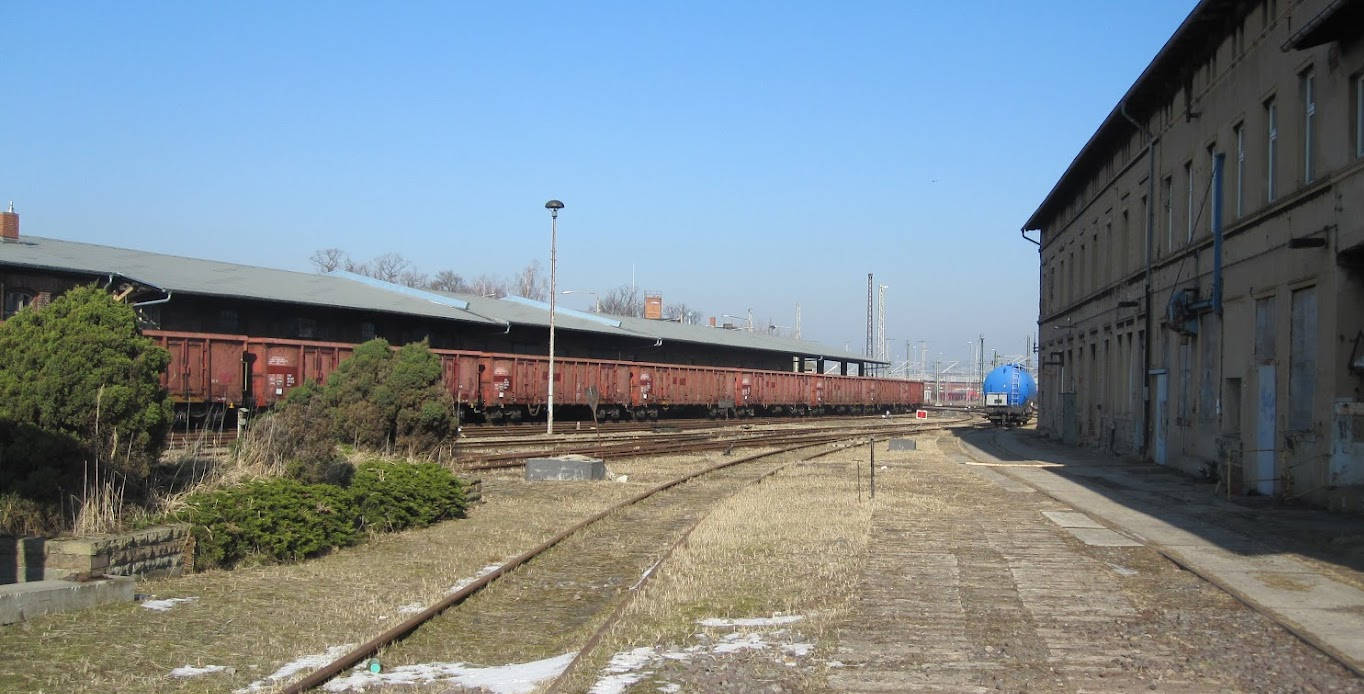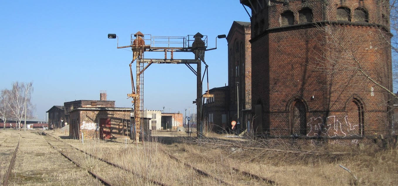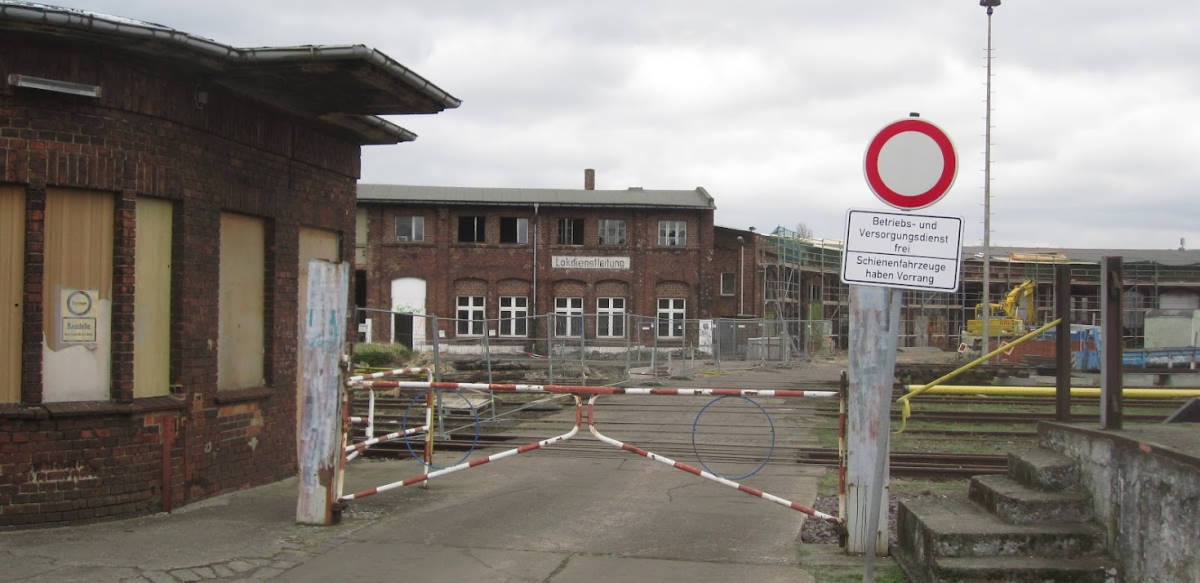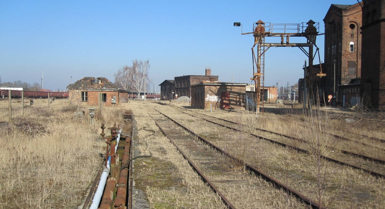 Ähnliches Bild wie oben. Vor 10 Jahren waren noch die Versorgungsleitungen für die ölgefeuerten Dampflokomotiven des Bahnbetriebswerks Wittenberge zu erkennen. In ihnen wurden Schweröl statt Steinkohle zum Erhitzen des Wassers im Kessel verbrannt.