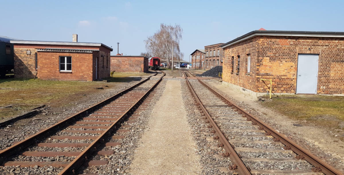 Blick auf die ehemalige Magdeburger Bahnhofsseite. Hier fuhren bis 1999 die Züge in und aus Richtung Süden. Heute finden hier unsere Führerstandsmitfahrten statt. Außerdem ist ein Gleisbaumaschine ausgestellt. Die Brachfläche daneben wird seit kurzem durch eine Straße und ein kleines Einkaufszentrum belebt.