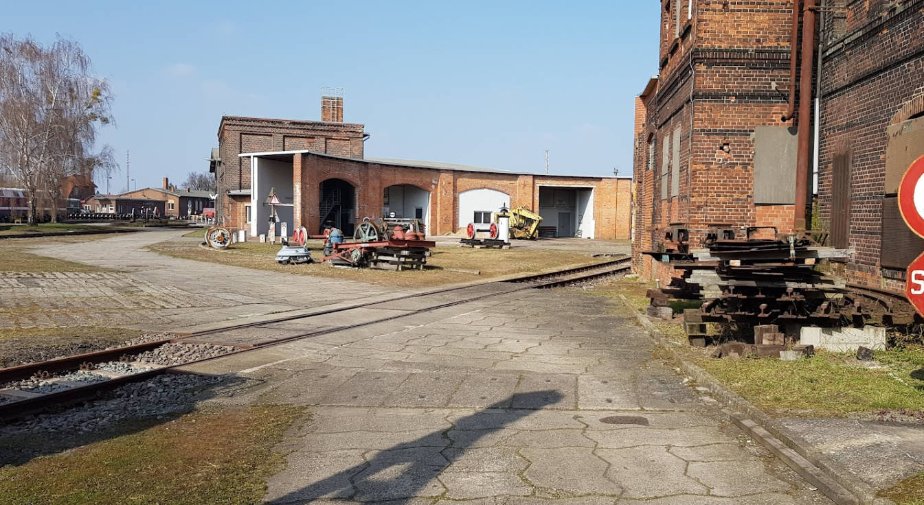 Blick zurück auf den Lokschuppen 2, der heute das Museum beherbergt. Rechts im Bild das ehemalige Wasserhaus, in dem sich ehemals große Wasserbehälter zur Versorgung der Dampflokomotiven befanden