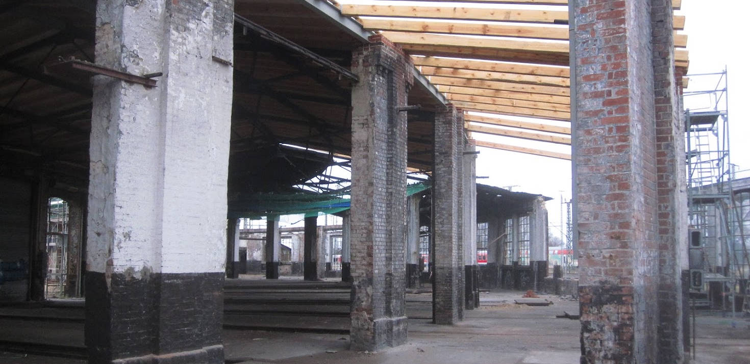 Ein Blick ins Innere des Lokschuppens. Zu Beginn der Revonierungsarbeiten musste teilweise die Rückwand des Lokschuppens abgetragen und durch ein Metallgerüst verstärkt wieder aufgebaut werden. Erst dann konnte ein neues Dach errichtet werden. Heute schützt es unsere Exponate vor Wind und Wetter.