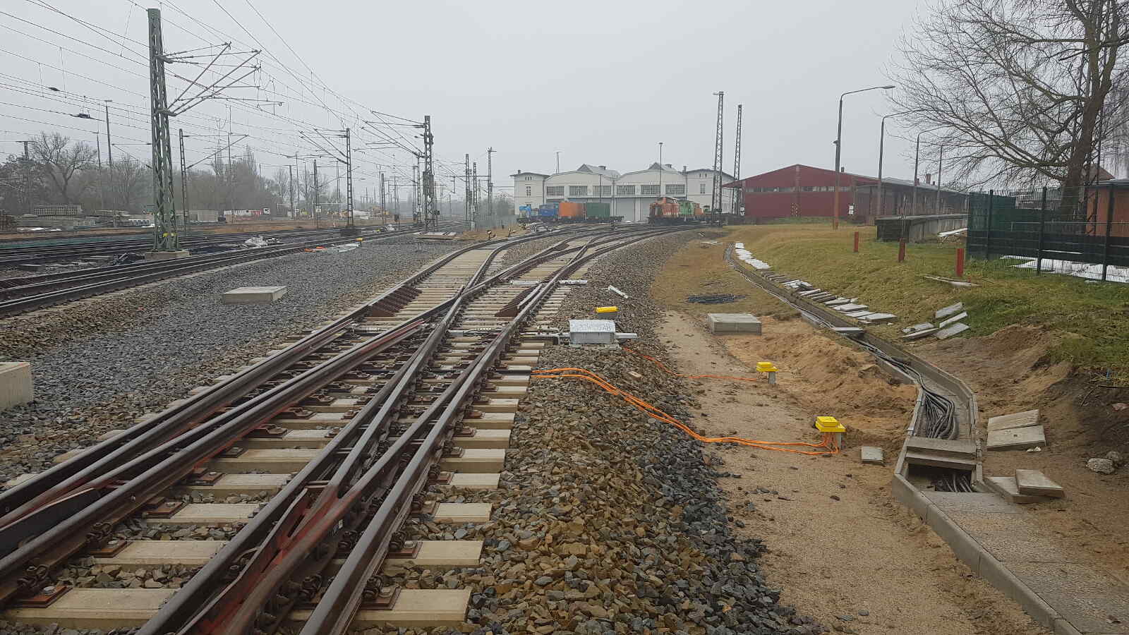 Today, we will show you the progress that has been made, particularly with regard to the new track connection to the depot. The track construction work here is now largely complete. However, the electrical equipment for the points, the signals that will regulate entry to the site in future, and their connection to the DB AG central signal box in Berlin are still missing. Work on this is in full swing.