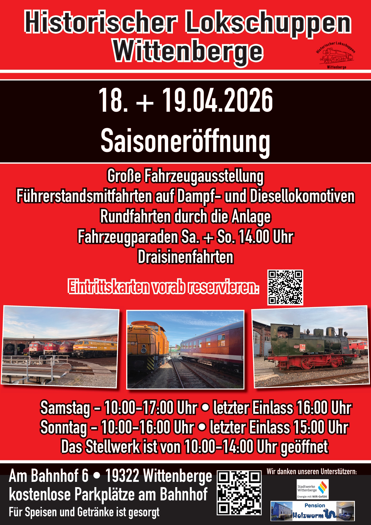 On the weekend of 18 and 19 April 2026, the wheels will be turning once again in Wittenberge. We therefore welcome all railway enthusiasts, young and old, to our ‘Spring Steam 2026’ event at the Historic Engine Shed. Our steam locomotive Emma will, of course, be back in action and will be competing with her modern sisters from the diesel locomotive fleet.