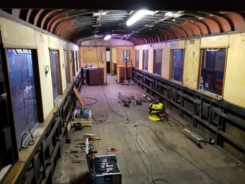 Fortschritte macht auch der VB 197 805, der ja inzwischen entkernt wurde, um die Innenseite der Karosserie mit Rostschutz zu behandeln. Inzwischen sind die ersten Innenverkleidungen am Fensterband wieder angebracht worden.
