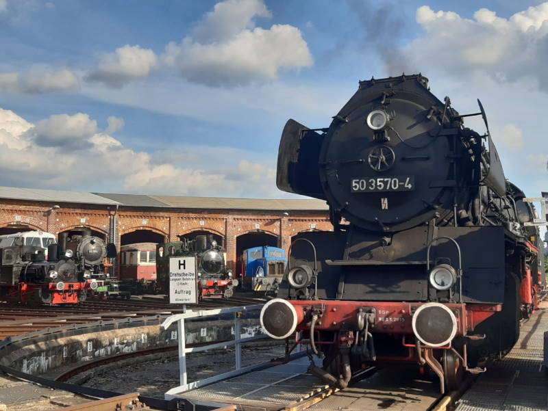 But one thing at a time: On the Friday before the event, the vehicles were arranged as usual, the steam locomotives were fired up and this time the necessary ground markings and guidance systems were also installed in order to organize a regulated visitor traffic with sodial distancing. In addition, 50 3570 was sent to the port of Wittenberge for a trial run to see if the work we had carried out on the runnung gear recently had been successful. The trip was completed without incident and the following photo shows the locomotive on its way to the harbour
