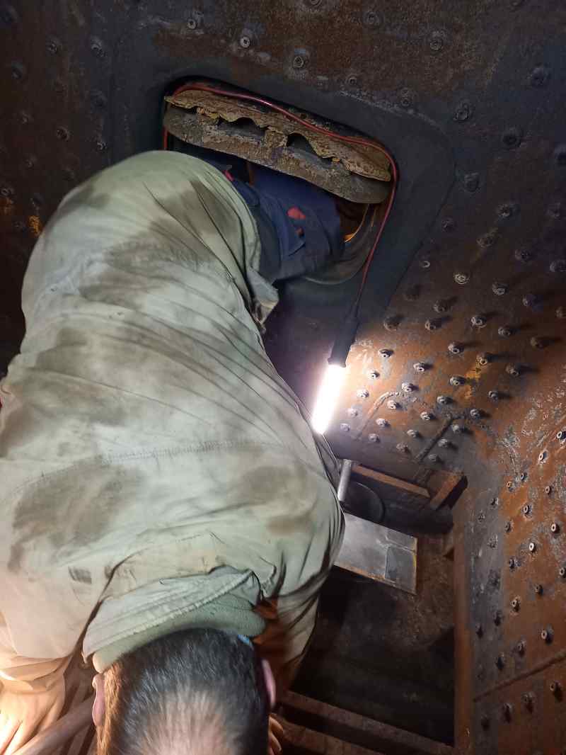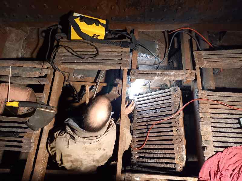 Further work was also done today on the ash box of steam locomotive 50 3570. New metal sheets were welded in. Unfortunately, the access is a bit difficult, as you can see in the following pictures. The colleagues had to climb through the narrow fire door into the firebox to reach the ash box from the inside.