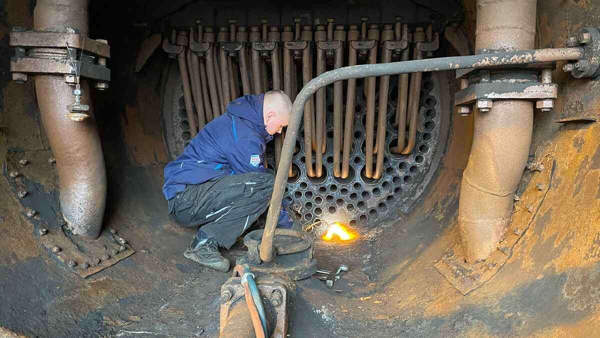 Dazu gehören insbesondere Arbeiten an unserer Dampflok 50 3570, die wir gerne im nächsten Jahr wieder betriebsfähig vorführen möchten. Dafür müssen wir etliche Arbeiten erledigen, die ziemlich zeitintensiv sind. Dazu gehört insbesondere die Kesselreparatur, die nun vorbereitet wird. Am vergangenen Samstag wurden einige Kräfte gebündelt, um den Kessel auszuwaschen. Dazu wurden alle Waschluken entfernt. Dabei handelt es sich um pilzförmige Verschlüsse, die kleine ovale Öffnungen in der Kesselwand abdichten, durch die man mit einem starken Wasserstrahl Verunreinigungen und Kalkrückstände aus dem Kessel herausspülen kann. Da die Muttern, die die Verschlüsse halten, manchmal extrem festsitzen, muss man sie teilweise mit einer Flamme rotglühend erhitzen, damit sie sich etwas ausdehnen und man sie lösen kann.