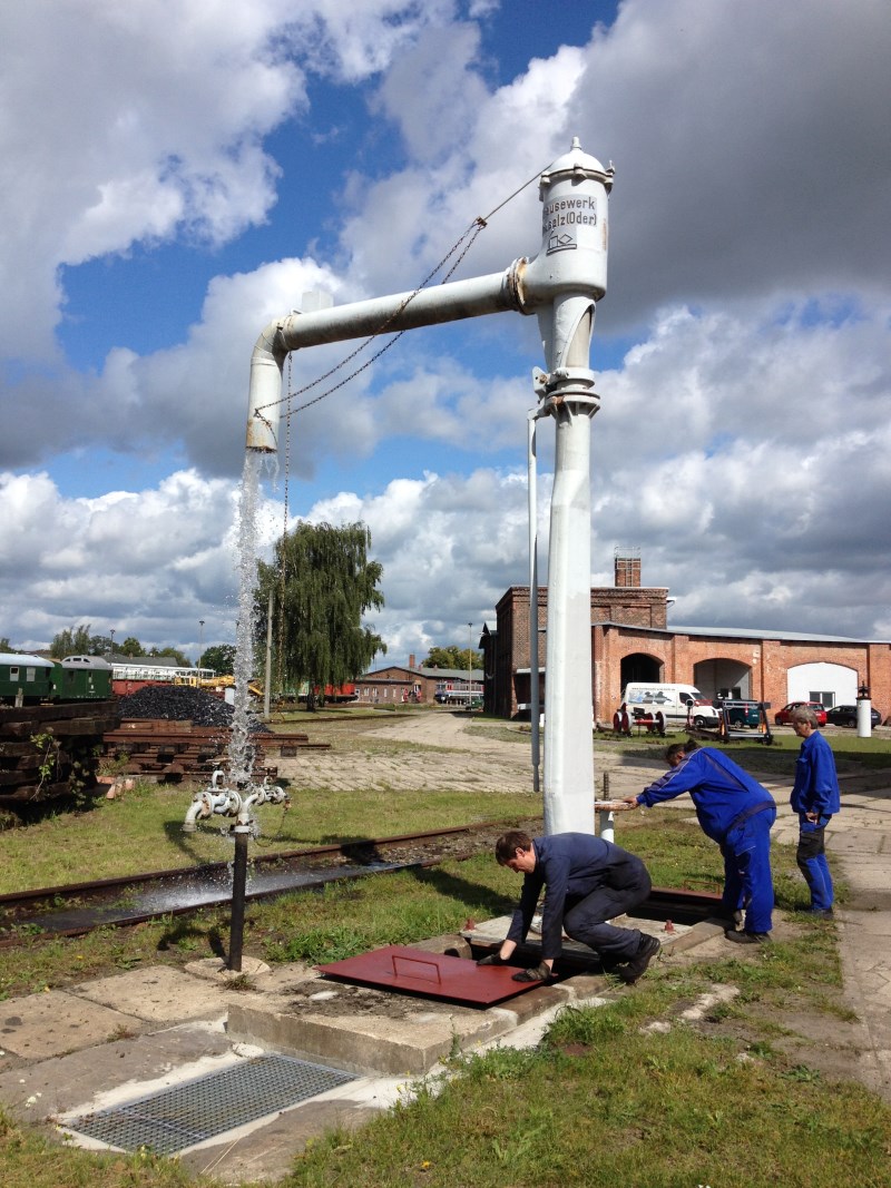 Zum ersten Mal seit 25 Jahren floss Wasser vom Wasserturm in einen wieder errichteten Wasserkran zum Betanken von Dampflokomotiven. Den Wasserkran haben wir vom Ausbesserungswerk Wittenberge der Deutschen Bahn AG zur Verfügung gestellt bekommen. In monatelangen Vorarbeiten hatten die Vereinsmitglieder an historischer Stelle ein dafür vorgesehenes Fundament freigelegt und instand gesetzt, Rohrleitungen geprüft und repariert und den Kran selbst errichtet. Auch der Wasserturm selbst, der ein Fassungsvermögen von rund 150m³ besitzt, wurde technisch überarbeitet und erhielt neue Pumpen zum Befüllen der Anlage. Der Wasserkran wird uns Befüllen unserer Dampfloks gute Dienste leisten und ist eine Attraktion für unsere Besucher. Ein weiterer Wasserkran wird demnächst vor der Lokleitung aufgestellt.