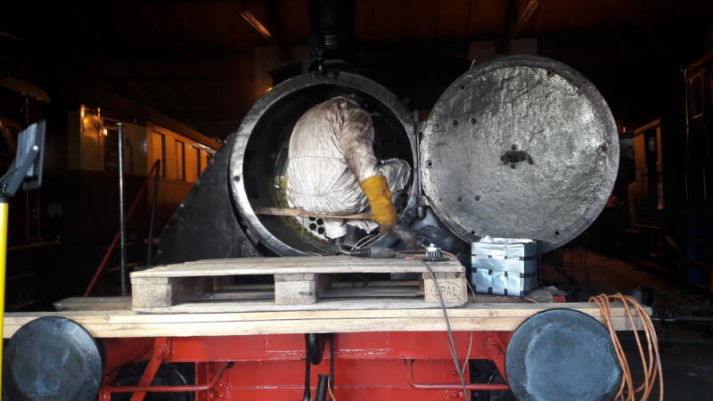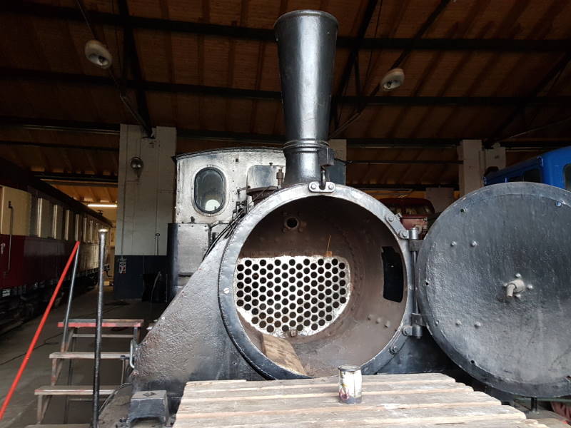 Man kann sich auch in die Rauchkammer der Dampflok Karlsruhe quetschen und und die Rohrwand für den Einbau neuer Rohre vorbereiten, damit die kleine Lok nächstes Jahr wieder dampfen kann …